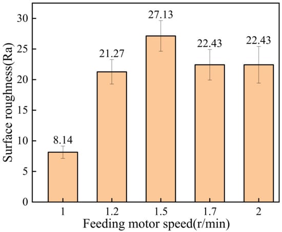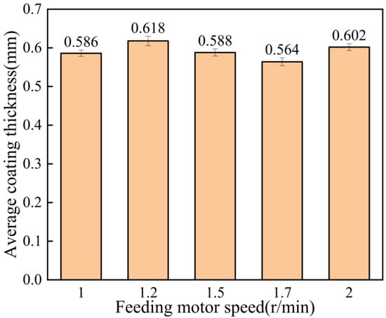 The surface roughness of the coatings at different feeding motor speeds is shown in Figure 11. As can be seen from the figure, the coating surface formed when the speed of the powder-feeding motor was 1.0 r/min, which was the most delicate. However, the coating formed when the speed was 1.5 r/min was the coarsest. Figure 12 shows the average thickness of the coating at different feeding motor speeds. It can be seen from the figure that in a certain range, the speed of the powder-feeding motor had little influence on the coating thickness, and the coating thickness was about 0.6 mm. The minimum thickness of the coating was 0.564 mm, but the maximum thickness of the coating was 0.618 mm at 1.2 r/min. When the speed of the powder-feeding motor was 1.0 r/min, the coating thickness was small. Because the slower the speed of the powder-feeding motor, the smaller the powder content in the spray gun per unit time, the worse the subsequent particle compaction effect, the longer the time taken to reach the activation cycle, and the smaller the coating thickness [,].