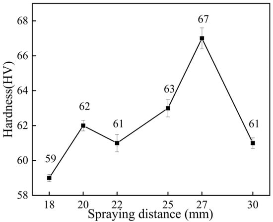 Figure 14 shows the microhardness test results of the coating at different spraying distances. As can be seen from the figure, the microhardness of the coating increased first and then decreased with the increase in the spraying distance. The maximum microhardness of the coating was 67 HV when the spraying distance was 27 mm, and the minimum was 59 HV when the spraying distance was 18 mm. The reason for the difference in the coating’s hardness is that the change of distance leads to changes in the shockwave on the surface of the substrate, and then this affects the particle velocity, leading to the different hardening effects of the coating []. It might also be because the particle acceleration effect was not obvious when the spraying distance was small, but the particle “scattering phenomenon” was more serious when the spraying distance was greater []. Therefore, when the spraying distance was 18 mm, the particle acceleration effect was not obvious, and when the spraying distance was 30 mm, the particle “scattering phenomenon” was more prominent. When the spraying distance was 27 mm, the particle deformation was sufficient, the coating was compact, and the work hardening effect was obvious.