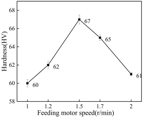 Figure 15 shows the microhardness test results of the coating at different feeding motor speeds. As can be seen from the figure, with the increase in the speed of the powder-feeding motor, the microhardness of the coating on the whole showed a trend of first increasing and then decreasing. The maximum microhardness of the coating was 67 HV when the motor speed was 1.5 r/min, and 60 HV when the motor speed was 1.0 r/min. When the feeding motor speed was 2 r/min, the microhardness of the coating decreased. The reason for this phenomenon was that when the feeding motor speed was too slow, the particles had a poor tamping effect on the coating, and the work hardening was not obvious. When the speed of the powder-feeding motor was too fast, the particles far from the axis of the spray gun increased. The particles farther away from the axis had lower velocities. This hardness difference occurs because the work hardening of the coating was reduced, as shown in Equation (1) [].