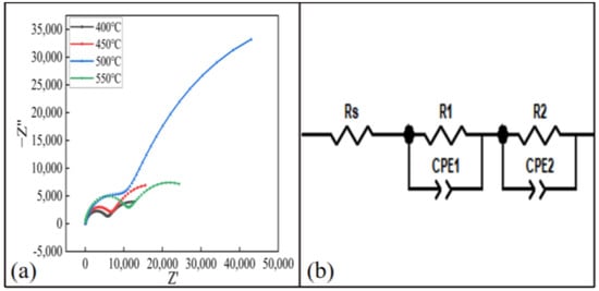 In order to study the corrosion behavior of the coating, the impedance spectrum of the coating was tested. The Nyquist of the coating at different spraying temperatures is shown in Figure 16a. The Nyquist diagram of each coating sample presented two semicircular shapes. It can be seen from the figure that the capacitance–reactance arc radius of the coating with a spraying temperature of 500 °C was the largest, so it had better barrier function []. The experimental EIS results were fitted by the equivalent circuit diagram shown in Figure 16b. Since the electrode system used in the experiment was not ideal, the capacitor element was replaced with a constant phase angle element (CPE) in the fitting process []. In the fitted circuit, Rs, R1 and R2 were the solution resistance, the charge transfer resistance and the additional resistance of the corrosion part, respectively. The constant phase element CPE1 was in parallel with R1, corresponding to a high-frequency semicircle. R2 was in parallel with the constant phase angle original CPE2. Take the sum of R1 and R2 to represent the corrosion resistance Re of the coating, that is, Re = R1 + R2 []. The Rs and Re of coatings sprayed at different spraying temperatures are shown in Table 4. It can be seen that the Re value of the 500 °C coating was the largest, so the anticorrosion performance of the coating was the best when the spraying temperature was 500 °C.