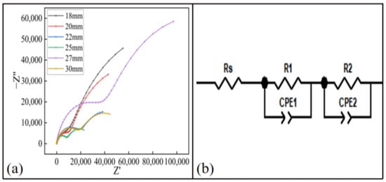 The Nyquist of the coating at different spraying distances is shown in Figure 17a. The Nyquist diagram of each coating sample presented two semicircular shapes. As can be seen from the figure, when the spraying distance was 27 mm, the capacitive arc radius of the coating was the largest, which had a better barrier function. This was because when the spraying distance was 27 mm, the particles were fully accelerated by the nozzle gas and were less affected by the shockwave on the substrate surface [], and could impact the substrate at a high speed. Therefore, the anticorrosion performance was optimal. The EIS results were fitted using the equivalent circuit diagram shown in Figure 17b. the resistance Rs and Re of the coating solution at different spraying distances are shown in Table 5. It can be seen that the Re value of the coating was the largest at 27 mm, so the anticorrosion performance of the coating was the best.