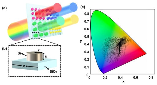 The schematic of the metasurface-based transmission-mode SCFs is illustrated in Figure 1a. We chose the Si cylindrical as the meta-atom to modulate the incident beam, and the SiO2 was chosen as the substrate of SCFs. As is shown in Figure 1b, the single-unit cell of the metasurface that we mainly investigated has three geometric parameters, including the radius (r), height (h) of each nanorod and the pitch (p) of the meta-atom. Different geometric parameters produce different optical response modulations, resulting in different colors. We used the EM simulation method FDTD to obtain the transmittance spectra corresponding with 5300 groups of different geometric parameter combinations. The wavelength band of the incident light is from 380 nm to 780 nm with an interval of 2 nm. The color values (x, y, Y) are obtained by converting the transmittance spectra through the CIE 1931 color-matching functions, while x and y define the position of colors on the chromatic diagram, and Y indicates the luminance. All the results calculated were plotted in the CIE xyY chromaticity diagram, which is shown in Figure 1c. Compared with the SCFs proposed previously, we achieved a larger coverage area of the CIE 1931 chromaticity diagram.