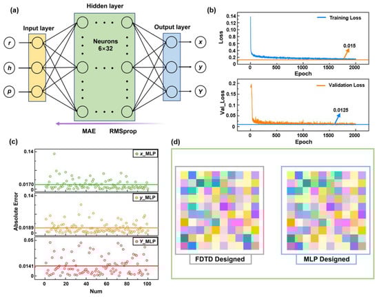 Taking the variation of all the three geometric parameters into account, the complexity of the metasurface design will inevitably increase. It becomes difficult to obtain the geometric parameters for the target optical response by using the traditional EM simulation. In recent years, ANN has been introduced into the field of micro–nano photonic device design, which is supposed to solve the problem of time and computational power consumption. At the very beginning, we trained the forward ANN to predict the optical response corresponding to the specific combination of geometric parameters. We started with a traditional MLP network as the forward model for predicting the Si colors accurately and instantly. TensorFlow and Keras were used to establish the basic architecture of MLP. Figure 3a illustrates the structure of the forward MLP model. The optimum MLP network contains six hidden layers; each layer is constructed from 32 neurons. The activation functions used in all the hidden layers are LeakyReLU, and sigmoid is used in the input layer and output layer. Moreover, MAE is selected as the loss function. Adam is used as the optimizer to realize the backpropagation algorithm. We input the geometric parameters (r, h, p) into the ANN and output the color values (x, y, Y). All 5300 data shown in Figure 1c were used as the dataset to train the network. During the training process, 5% of the dataset were separated as the validation data and 100 groups as the test data. All the rest of the data were employed as the training data to update the weights of ANN. The complete training process contains 2000 iterations (epochs = 2000). The batch size is 256 and the learning rate is 0.001.