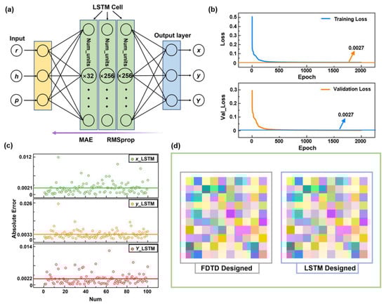 Figure 4b shows the changes of training error and the validation error during the training process. The training error values decline continuously to 0.0027, and the validation error decreases to a same constant after 500 epochs. During the subsequent training, the loss value barely decreases, indicating that the training is complete. Obviously, the decreasing rate of the loss value in LSTM training is much faster than that in MLP, and the oscillation of the loss value change in the training process can be neglected. In addition, with the same number of training epochs, the loss value of LSTM is much lower than that of MLP, indicating that LSTM converges easier than MLP. To further verify the efficiency and accuracy of our forward LSTM neural network, 100 groups of data were used for testing. The results predicted by LSTM were compared with the colors obtained by EM simulated spectrums, and the absolute error was calculated. As is shown in Figure 3c, the top, middle and bottom subgraphs represent the absolute errors of x, y and Y values, respectively. The mean absolute errors are 0.0021, 0.0033 and 0.0022, respectively. It proves that LSTM shows much more accurate predicting performance than MLP. The prediction time cost of LSTM is about 26 ms, which differs little from MLP. Figure 4d illustrates the comparison between 100 groups of test data and predicted colors, and it is hard to distinguish the difference by human eye. All the results demonstrated in Figure 4 indicate that LSTM is more efficient and powerful in metasurface design.