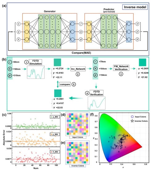 (a) Schematic of inverse ANN for predicting the micro–nano structures. (b) Metasurface inverse design and the results’ verification process. (c) The absolute error between the simulated colors and inverse-designed structural colors. (d,e) The 100 groups’ colors designed by FDTD and inverse ANN. (f) The coverage of 100 groups’ real and inverse colors by SCF on the CIE 1931 chromatic diagram.