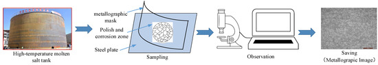 High-pressure equipment is widely used in the oil, chemical, and power industries. It has been reported that 4,396,300 pressure vessels and 1,012,600 km of high-pressure pipelines are currently in use in China [1]. Chromium-molybdenum steel is one of the main materials used to manufacture pressure vessels and high-pressure pipelines. The normal microstructures of this steel are ferrite and pearlite. However, pearlite spheroidization will occur in chrome-molybdenum steel after long-term exposure to a high-temperature environment, and this results in material degradation or even structural failure. Therefore, spherular pearlite gradation is an important evaluation indicator used to judge the performance of chrome-molybdenum steel [2,3]. In practice, the gradation of spherular pearlite is determined by metallographic examination, which is a microscopic examination method used to establish the microstructures and damage modes of metal materials, as illustrated in Figure 1.