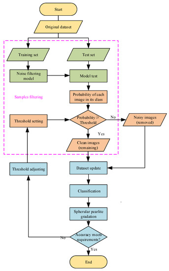 Reducing the influence of noisy samples on the model training process is essential for label noise learning. To delete the samples that are most likely to have been wrongly labeled, we added a filtering process for the datasets and a retraining process for the models. Models that were trained on raw datasets were used to filter out the noisy images, and these models were then retrained on the remaining datasets to obtain the classification models. A gradation of spherular pearlite by metallographic image recognition is an image classification task. CNNs are used as classification models in this paper. However, the datasets would normally be too small to train deep learning models if too many samples were deleted. A filter threshold was thus proposed to control the number of samples that were deleted. The optimum filter threshold was determined based on the prediction results of the classification models. The steps of the proposed method are illustrated in Figure 2.