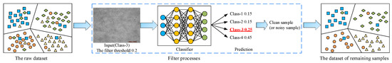 As shown in Figure 4, when a sample is input, deep learning models will output its probability in each class. If the probability of the sample being in its real class is greater than or equal to the filtering threshold, the sample is considered to be a clean sample and retained. Otherwise, the sample is removed from the raw dataset since it is considered to be a noisy sample.