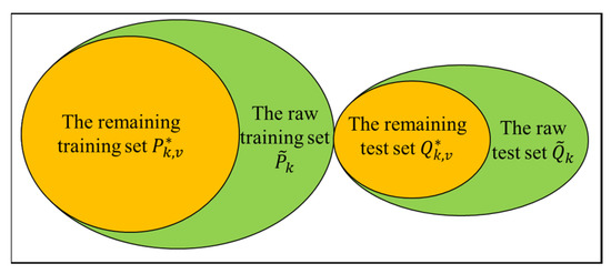 We obtain a remaining dataset , a remaining training set , and a remaining test set using this approach. They are given as,