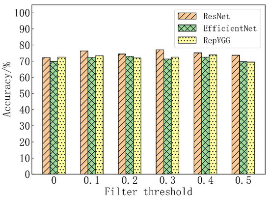 Overall, the accuracy initially increased and subsequently decreased when the filter threshold increased. The results in Table 5 show that the image numbers decreased when the filter threshold increased. Therefore, the filter threshold is an upper-limited-type threshold. The value of the filter threshold should not be too large to ensure that the required recognition effect is realized. It is set to be less than 0.5 to ensure that more than 50% of the images are retained. The images in the training set can then represent the overall distribution of the dataset and reduce overfitting of the model.