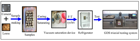 The cement used in the CIL is Grade 42.5 ordinary Portland cement with a content of 6% and initial setting time of 4 h. The optimal moisture content of the CIL is 11.9%, and the maximum dry density is 1.85 g/cm3. The optimum moisture content was chosen to make samples in the tests, and the samples are cylinders with a height of 80 mm and a diameter of 60 mm. The sample preparation time was controlled within the initial setting time of the cement, and the curing time in the moisturizing cylinder at 20 °C is 14 days after the sample preparation is completed. The samples were then placed in an environment box for F-T cycles after curing and saturation. The triaxial compression tests were performed under consolidated undrained condition in a GDS triaxial testing system. The test parameters are listed in Table 2, and the test process is depicted in Figure 1.
