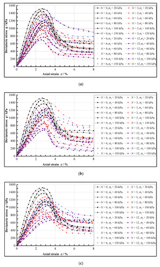 The results of triaxial tests using samples experienced F-T cycles at freezing temperatures of −5 °C, −10 °C, and −15 °C under different F-T cycle numbers (0, 1, 3, 6, 9, and 12) are as shown in Figure 2.