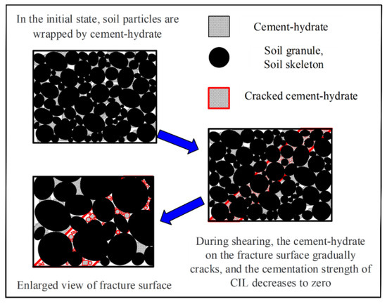 As a kind of reinforced composite material, the strength of CIL is mainly comprised of the cementation strength of the cement hydrate and the friction strength between particles, and its loading mechanism is in accordance with the binary-medium theory under the theoretical framework of geotechnical breakage mechanics. According to the binary-medium theory, the CIL is abstractly divided into bonded elements and frictional elements, both of which share the external load. The deformation modulus of the bonded element is much higher than that of the frictional element. The bonded elements are gradually broken and transformed into frictional elements in the shearing process, and the initial micro fractures in the soil are gradually expanded, and form a local shear zone along with the damage of the bonded element. When the strain further increases, the local shear zone will develop into the macroscopic rupture surface and expand in the whole soil body, finally leading to the destruction of the soil structure.