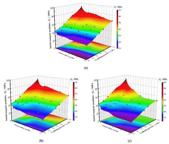 It can be seen that the initial tangent modulus gradually increases with the growing confining pressures and decreases with the increase in the F-T cycle number, and the largest decreasing amplitude can be seen after the first F-T cycle. The initial tangent modulus also decreases with the reduction in the freezing temperature. For example, with the confining pressure of 150 kPa and the freezing temperature of −5 °C, the initial tangent modulus loses 10.6% of its original value after the first F-T cycle and 26.7% of its original value after the twelfth F-T cycle. At the freezing temperature of −10 °C with the same confining pressure, it loses 15.3% and 32.9%, respectively, after the first and twelfth F-T cycles. At the freezing temperature of −15 °C with the same confining pressure, it loses 16.7% and 46.4%, respectively, after the first and twelfth F-T cycles. This is due to the fact that the pore water undergoing volume expansion and contraction will alter the arrangement of soil particles and the connection between soil particles during the F-T process, and lead to the degradation of the occlusion and bonding strength. The lower the freezing temperature, the more intense the expansion and contraction of the pore water during the F-T cycles.