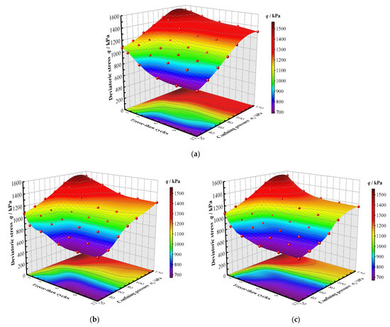 Based on the relationship between the deviatoric stress and axial strain of CIL samples, the peak stress of the strain-softening curves is taken as the critical strength (China National Standard, GB/T50123–2019) [44]. The relationship between the strength of CIL, the F-T cycle number and the factor of the confining pressure is shown in Figure 5.