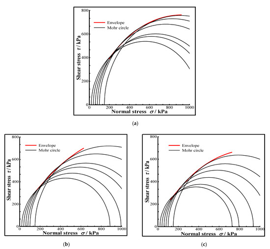Equations (6), (9) and (11) are the expressions of the nonlinear Mohr-Coulomb strength criterion for CIL, and the Mohr circle and its strength envelope were plotted, as shown in Figure 7.