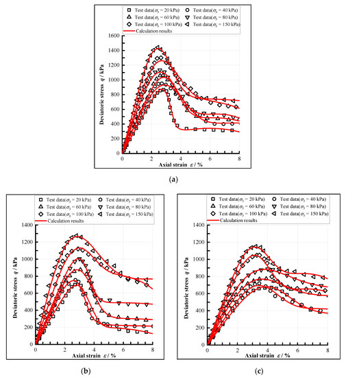Combining the test results with Equation (27), the model calculation results can be obtained, as shown in Figure 9 and Table 4. It can be seen that the model can greatly simulate the stress-strain relationship of CIL, especially for the strain-softening phenomenon.