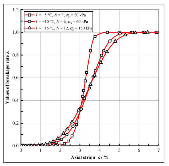 Combining the calculation results with Equation (26), the values of the breakage rate used in the present constitutive model can be obtained, and Figure 10 shows the variation in breakage rate versus strain under different conditions.