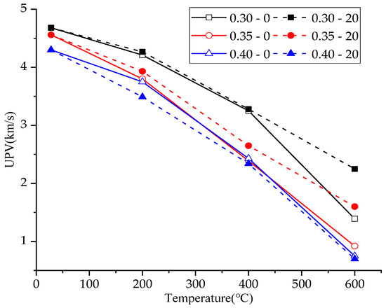 The data show that under the same temperature, the lower the water/cement ratio, the higher the ultrasonic pulse velocity of concrete, which can be explained from two aspects. The smaller the water/cement ratio was, the denser the concrete was, and the higher the ultrasonic pulse velocity was. In addition, with the decrease of water/cement ratio under normal temperature curing, more cement particles of concrete were not hydrated, which means that concrete can continue to be hydrated under high temperature and delay the decrease of ultrasonic pulse velocity caused by high temperature.