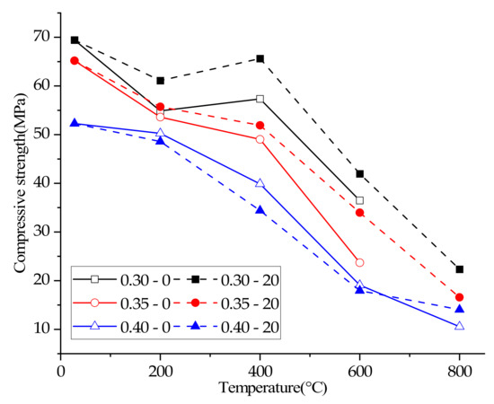 - After exposure to a high temperature (400 °C), the compressive strength of 0.30–0–400 °C was 4.48% higher than 0.30–0–200 °C, and the compressive strength of 0.30–20–400 °C was 7.38% higher than 0.30–20–200 °C. The increase of compressive strength can be attributed to the hydration of unhydrated cement particles of concrete and the Van der Waals force.
