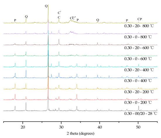 Because quartz has good high temperature resistance, the peak intensity of Quartz is very stable at high temperatures. High temperatures can promote the continuous hydration of unhydrated cement particles to generate CH. When the temperature exceeded 400 °C, CH rapidly decomposed [33]. Therefore, the content of CH reached its maximum strength around 400 °C [3]. As the temperature rose, the concrete cracked more rapidly, and a large amount of carbon dioxide in the air reacted with CH and calcium oxide to generate calcium carbonate. The content of calcium carbonate reached its maximum value at 600 °C, and when the temperature exceeded 700 °C, calcium carbonate decomposed in a large amount [34]. However, as the specimens stood still for 7 days, calcium oxide in the specimen reacted with carbon dioxide to generate calcium carbonate again. As C-S-H gel was dehydrated at a high temperature to generate calcium silicate [3,32], the content of dicalcium silicate continued to rise when the temperature exceeded 400 °C.