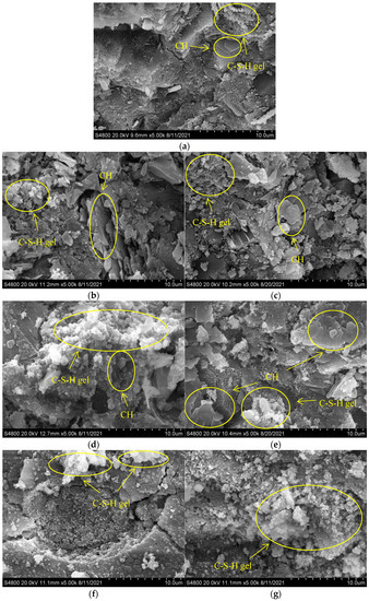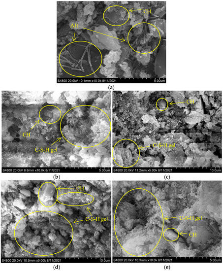 The treatment process of mortar fragments was the same as that in Section 2.3.5. The mortar fragments were sprayed with gold and placed under a scanning electron microscope for observation. HITACHI S-4800 (Tokyo, Japan) was adopted in this test.