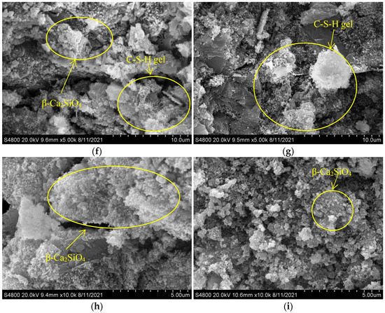 SEM analysis of concrete (water/cement ratio of 0.40). (a) 0.40–0/20–28 °C, (b) 0.40–0–200 °C, (c) 0.40–20–200 °C, (d) 0.40–0–400 °C, (e) 0.40–20–400 °C, (f) 0.40–0–600 °C, (g) 0.40–20–600 °C, (h) 0.40–0–800 °C, (i) 0.40–20–800 °C.
