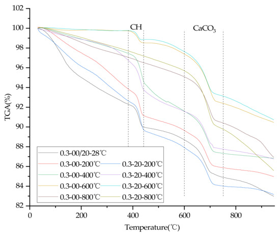 In order to quantify the effects of temperature, water/cement ratio and plastering layer on the contents of C-S-H gel of concrete, thermogravimetric tests were carried out in this study. Figure 8 and Figure 9 are TGA diagrams of concrete with 0.3 and 0.4 water/cement ratio, respectively.