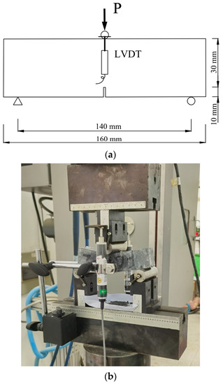 The tested mechanical properties include the compressive and flexural strength at 3 and 28 days and fracture properties at 28 days. The test method for the strength measurements was the same as the method given in standard ISO 679-2009 [21], except that the loading rate of the compressive and flexural strength was 4 kN/s and 100 N/s, respectively. The fracture properties were investigated by conducting a three-point bending test on a notched specimen [9], and three specimens were tested for each group. The notch was prepared at the middle of the specimen using a diamond saw (TDM1260, Bosch, Hangzhou, China) and its depth and width was 10 mm and 3 mm, respectively. The bending test was conducted on an MTS machine (810, MTS, Eden Prairie, MN, USA), and the schematic diagram as well as the experimental setup are given in Figure 2. The span between the two supports was 140 mm, being equal to 3.5 times the depth of the specimen. Two linear variable differential transformers (LVDT) were fixed at the side of the specimen to measure the mid-span deflection, and the measuring capacity of the LVDT was 25 mm. The test was controlled by actuator displacement. The displacement rate was initially 0.5 mm/min until a displacement of 0.5 mm and then was doubled to 1 mm/min for 1 min, followed by 2 mm/min for 1 min, and finally was increased to 5 mm/min for 3 min before the test was ended. Load and deflection data were recorded throughout the loading process and fracture properties, such as peak load, residual load as well as fracture energy, could be analyzed based on the acquired load–deflection (P–δ) curves. The fracture energy GF was determined according to RILEM TC 50-FMC [22] using the following formula:
