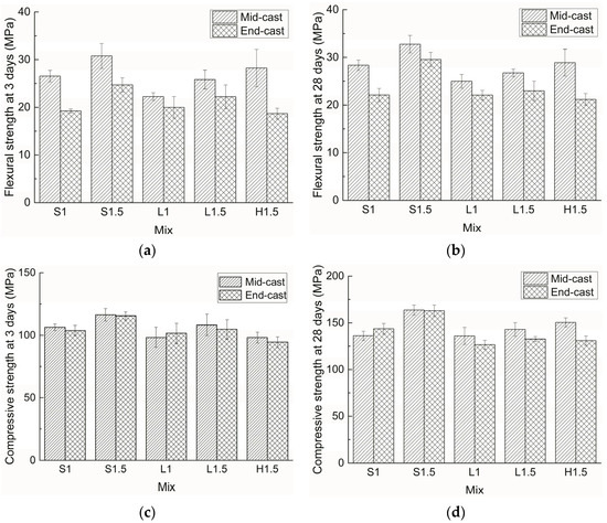 In Figure 3a,b, it can be seen that the mid-cast specimens show higher flexural strength than their end-cast counterparts. This is mainly because during casting the fibers move more slowly than the mortar and thus, in mid-cast mode, fibers tend to aggregate at the middle of the mold, which leads to an enhanced load-bearing capacity in the flexural test. Compared to specimens with straight fibers, the flexural strength of specimens with hooked-end fibers is more likely to be affected by the casting position. At 28 days, the flexural strengths of S1.5 and L1.5 with end casting are 90% and 86% of their mid-cast counterparts, respectively, while the ratio is merely 73% for H1.5. This could be attributed to the relatively large dimension and irregular shape of the hooked-end fibers, which might encounter more resistance during migration, resulting in a big difference in fiber content at the middle of the specimen using the two casting methods. Moreover, it can be seen that the influence of casting position on flexural strength is affected by fiber content. With the increase of fibers in the material, the flexural strength of specimens with short straight fibers become less affected by the casting position while that of specimens with long straight fibers shows an opposite trend.
