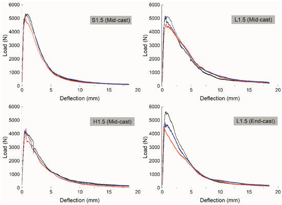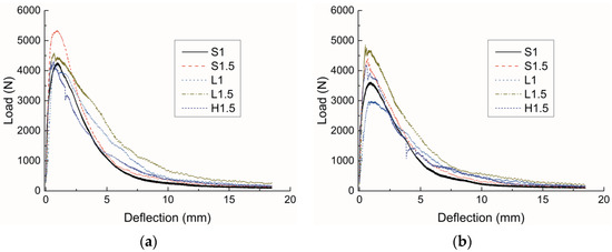 Representative load–deflection curves of all UHPCs with two different casting positions: (a) mid-cast, (b) end-cast.