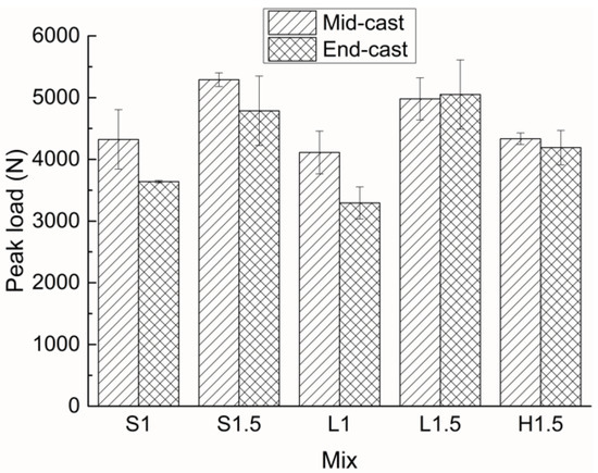 The representative P–δ curves of all the mixes with two different casting positions are given in Figure 5, and the peak loads of all the samples are presented in Figure 6. Similar to the results for flexural strength, specimens with short straight fibers have higher peak loads than those with long straight fibers. However, the latter exhibit higher toughness, which can be characterized by the area under the P–δ curve, than the former. This is ‘sbecause the densely distributed short fibers can arrest and delay the formation and coalescence of micro-cracks, which leads to a higher peak load, while the long fibers are more effective in preventing the propagation of macro-cracks and thus contribute to a higher toughness [23]. Compared to specimens with straight fibers, the samples with hooked-end fibers show lower mechanical performance, which is inconsistent with the results in the literature [24,25]. This might indicate that in this work the hooked-end fibers have a poor orientation and distribution at the middle of the specimen, and thus the enhancing effects of the fibers are not well developed.