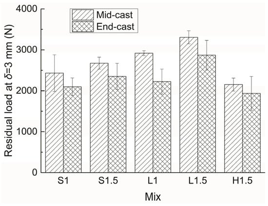 The residual loads at δ = 3 mm of all the mixes with two different casting positions are presented in Figure 7. Compared with Figure 3 and Figure 6, it can be seen that the influences of casting position on peak load and residual load are similar to that on flexural strength. Mid-cast specimens generally have higher peak loads and residual loads than their end-cast counterparts. For mix H1.5, the influence of casting position on the two loads is much less significant than that on flexural strength, which again indicates that the distribution of hooked-end fibers varies considerably between different replicates. Moreover, the residual-to-peak load ratio (R/P) can be used to evaluate the post-cracking load-bearing capacity of a structural member. For each mix, the R/P values are close independent of the two casting positions. The R/P value is affected by fiber type, with higher values for long straight fiber reinforced specimens, medium values for short straight fiber reinforced specimens, and lower values for hooked-end fiber reinforced specimens. In addition, the R/P value decreases as fiber content increases. Therefore, among the five mixes, L1 shows the highest R/P value of about 0.7, and H1.5 gives the lowest R/P value of about 0.48.