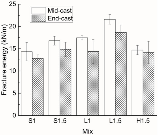 Figure 8 presents the fracture energies of all the UHPCs with two different casting positions. It can be observed that the basic shape and trend of the bar graph are almost the same as those shown in Figure 7, which implies that the residual load could be used as a simplified toughness index. With the increase of fiber content from 1% to 1.5%, the fracture energy of UHPC is increased by about 20%. The fracture energy of specimens with long straight fibers is higher than that with the other two fibers, and even L1 shows higher fracture energy than S1.5 and H1.5. Compared with end casting, the fracture energy is increased under middle casting. The increase rate is 12% and 20% for short straight and long straight fiber reinforced specimens, respectively, and merely 4% for specimens with hooked-end fibers. In addition, the fracture energy of end-cast samples is generally more scattered than that of mid-cast ones.