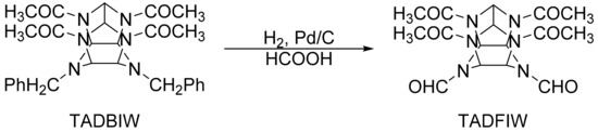 As shown in Figure 5, the synthesis of TADFIW is based on TADBIW. Add TADBIW and formic acid into a reaction bottle, remove the air in the reaction bottle, and introduce normal-pressure hydrogen at a certain temperature for hydrogenolysis. The reaction stops when the system no longer absorbs hydrogen. After the reaction is finished, the TADFIW with certain purity can be obtained after the operations of washing, decompression, and the like. In 1997, Thiokol published the detailed process and conditions for the synthesis of HNIW by using TADFIW as a nitration precursor. In this process, bromobenzene was used as the bromine source and dimethylformamide (DMF) as the solvent [22,41]. DMF is a Lewis base, which can neutralize the acid generated in the medium or in the reaction process, keep the medium in a low-acidic environment, increase the solubility of HBIW in the hydrolytic medium, accelerate the reaction speed of hydrolytic acetylation, reduce the existence time of HBIW in the reaction medium, prevent and halt the breakdown of the cage structure, and reduce the decomposition of the reaction substrate. The yield of TADBIW reached more than 80% by Thiokol, and it was further hydrolyzed in HCOOH medium to obtain TADFIW. TADFIW was then nitrated in nitric-sulfuric mixed acids to form the target product, CL-20, with a high yield. The United States used the TADFIW route to prepare CL-20 up to ten tons. However, formyl acetyl was difficult to be separated, which resulted in the CL-20 containing 2%~3% of pentanitromonoformylhexazazoisowoodane impurity, which affected the detonation and the safety performance of CL-20 [3,42,43]. After 2002, the United States abandoned the TADFIW route; however, some countries, such as Iran, are still working on the relevant work [20].