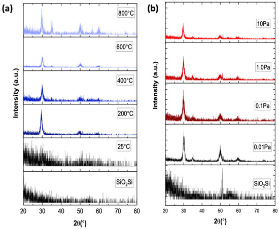 XRD stacked pattern. (a) Diffraction peaks of ScYSZ thin film on SiO2-Si prepared with various substrate temperatures (Ts = 25 °C, 200 °C, 400 °C, 600 °C, and 800 °C) at = 0.1 Pa and (b) XRD of ScYSZ thin film on SiO2-Si prepared at Ts = 600 °C, with various oxygen partial pressures, = 0.01 Pa, 0.1 Pa, 1.0 Pa and 10 Pa.