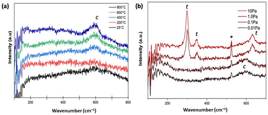 Raman spectra of (a) as-deposited ScYSZ thin films on PtTi-SiO2-Si substrate with varying substrate deposition temperatures, Ts = 25 °C, 200 °C, 400 °C, 600 °C, and 800 °C, with constant = 0.1 Pa; and (b) with various oxygen partial pressures, = 0.01 Pa, 0.1 Pa, 1.0 Pa and 10 Pa, at Ts = 600 °C. (* SiO2 substrate).