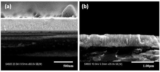 Figure 3 shows the cross-sectional SEM images of the deposited thin films for Ts = 25 °C (Figure 3a) and Ts = 800 °C (Figure 3b) with oxygen partial pressure of = 0.1 Pa and deposition rate of about 70 nm/h. Although both substrate temperatures showed a dense morphology, a more crystalized columnar structure can be observed at high substrate temperature.