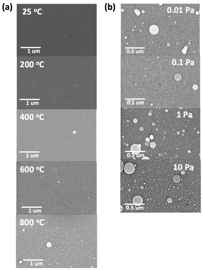The surface morphologies of the deposited thin films at different substrate temperatures and oxygen partial pressures are shown in Figure 4a,b, respectively. As can be observed in Figure 4a, the images revealed dense and crack-free surfaces, with the presence of droplets or circular agglomerates that increases at increasing deposition temperature. These agglomerated droplets are ScYSZ particles which are characteristic deposits for oxide films prepared using Nd:YAG laser system in PLD [20,33,35]. On the other hand, Figure 4b showed the SEM surface images of the as-deposited thin film on SiO2-Si substrate at various oxygen partial pressure. At increasing oxygen partial pressure, more porous and rough surface microstructures are observable. This effect on the surface morphology using higher oxygen partial pressure during deposition is consistent with reported works on the microstructure of ZrO2 thin films [19,24,25,36].