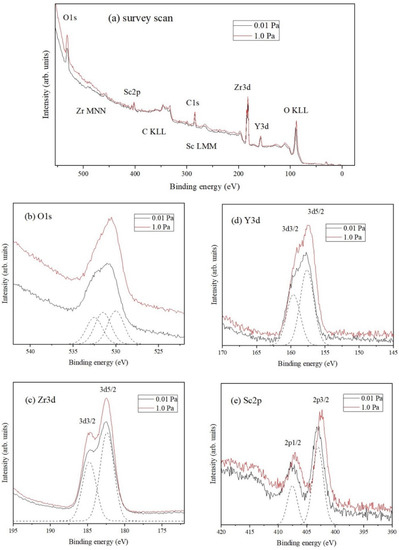 Figure 5b shows the PES stacked spectra of the O 1s core level for ScYSZ thin films deposited at = 0.01 Pa and 1.0 Pa. The PES spectrum was observed to be slightly asymmetric for both , 0.01 Pa and 1.0 Pa. A sample deconvolution of the peaks, for the 0.01 Pa spectrum, is also shown. As revealed, O 1s can be deconvoluted or fitted into three peaks centered at 530.0, 531.5, and 532.5 eV, for both . These binding energies are typical values for O1s lattice oxygen (oxygen bonded with Zr and/or Sc/Y), hydroxyl, and weakly adsorbed oxygen/H2O [42,43,44,45]. The PES stacked spectra of Zr 3d, Y 3d, and Sc 2p for the two oxygen partial pressures are shown in Figure 5c–e, respectively. Spin-orbit splitting can be observed from these spectra. Figure 5c shows the PES spectra of Zr 3d consisting of Zr 3d5/2 and Zr 3d3/2, corresponding to the Zr4+ valence state, with binding energies located at 182.4 eV and 184.8 eV for 1.0 Pa, respectively. On the other hand, Figure 5d shows the PES spectrum of Y 3d that is slightly asymmetric which consists of Y 3d5/2 and Y 3d3/2 with binding energies located 157.2 eV and 159.2 eV for 1.0 Pa corresponding to the Y3+ valence state. The PES spectrum of Sc 2p consisting of Sc 2p3/2 and Sc 2p1/2 is shown in Figure 5e, with binding energies located at 402.4 eV and 406.9 eV ( 1.0 Pa), corresponding to Sc3+ valence state.