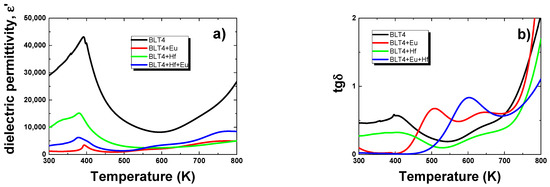 The value of dielectric permittivity was significantly reduced, which excluded the applicability of the obtained material, however, the ceramics were very interesting from the point of view of basic research. Due to this fact the decision was made to carry out further research. Figure 3 presents the characteristics of ε(T) and tgδ(T) of pure and modified BLT4 samples at a frequency in the measuring field equal to 1 kHz in a temperature range of 300–800 K.