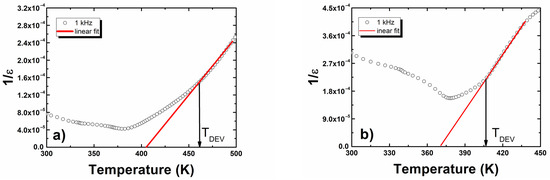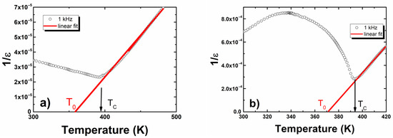 The 1/ε(T) dependencies obtained for hafnium-doped BLT4 ceramics, as well as europium- and hafnium-modified BLT4, fulfilled the Curie–Weiss law, which started from temperature TDEV (Figure 5).