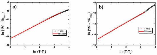 where εmax is the maximum value of the dielectric constant at the transition temperature (Tm), C is the Curie-like constant, and γ is the degree of diffuseness (1 ≤ γ ≤ 2). The limiting values γ = 1 and γ = 2 reduced the expression to the Curie–Weiss law, which was obligatory for the case of a normal ferroelectric and for the quadratic dependence that is valid for an ideal ferroelectric relaxor, respectively. The parameter γ was obtained by fitting the experimental data into Equation (1) (Figure 6).