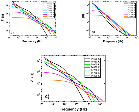 The microstructures of the ceramics are closely related to their electrical behavior. The changes in grain size and material porosity had a strong influence on the conductivity of the materials. The characterization of the electrical behavior of the ceramics was performed by impedance spectroscopy methods. The basis of the technique was the analysis of the AC system response to a sinusoidal perturbation. The analysis led to the calculation of the real (Z′) and imaginary parts (Z″) of the complex impedance as a frequency function. Figure 7 shows the dependences of the real part of the impedance of frequency at different temperatures and for various admixtures.