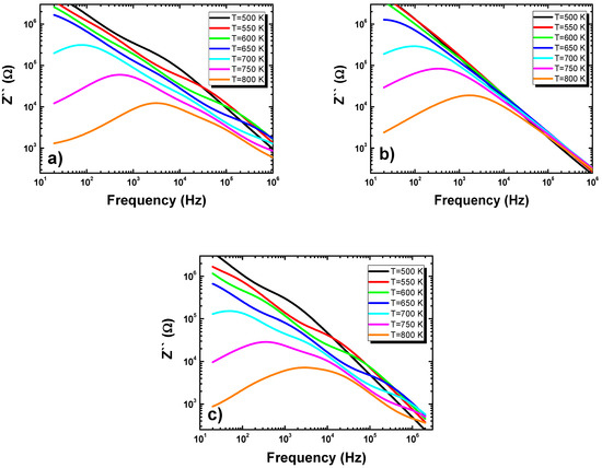 Figure 8 shows the dependences of the imaginary part of the impedance of frequency at different temperatures and for various admixtures. The broadened peaks shifted towards higher frequencies with rising temperatures, indicating the presence of a relaxation process in the system. The electron/immobile species were responsible for the start of the relaxation process at low-temperature regions, whereas the defects were in charge of the process at higher temperatures.