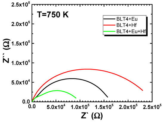 Complex-plane impedance (Nyquist plot) of modified BLT4 ceramics measured at temperature 750 K.