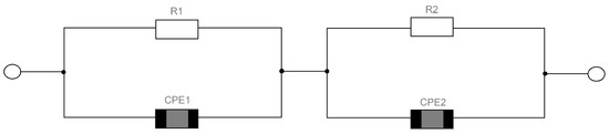 It is commonly known that the grain interior and grain boundaries are usually characterized by different values of resistance and capacitance. They can be represented by an equivalent electric circuit consisting of a parallel combination of two resistance and capacitance (RC) circuits connected in series. The values of RC parameters were evaluated from the fitting of the impedance spectrum; however, the quality of the matching was not satisfactory. This was reflected in the high values of the chi-square test χ2 (~10−3). The equivalent circuit underwent a modification, which was used by many authors, in the compounds based on BaTiO3 [24,33], and for other ceramics materials, in which the crystalline structure was significantly different from classical perovskites [34,35]. Namely, two capacitors in the RC circuits were replaced with constant phase elements (CPE1 and CPE2) (Figure 11). The impedance of a CPE element is given as:
