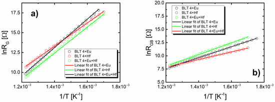 Microstructure analysis confirmed the appropriate selection of sintering conditions. All discussed ceramic materials were characterized by well-formed, angular, and homogenous grains. The grain growth was particularly good for hafnium-doped BLT4 ceramics. The grains were well packed, which resulted in increased density and reduced porosity of the materials. However, the improvement of the microstructure did not connect with the enhancement of the dielectric properties. The value of dielectric permittivity significantly decreased in the discussed samples. For pure ceramics at room temperature, it was equal to 30,000, while in the samples with the addition of hafnium ions it decreased to about 10,000. The value of dielectric permittivity of the other samples discussed in this paper was significantly lower. It is commonly known that the electrical conductivity of ceramics is closely related to the relaxation processes occurring in the interior of the ceramic, i.e., in the grains, in the grain boundaries, and in the electrode areas [39]. To determine the effect of admixture on the electrical properties of BLT4 ceramics, impedance spectroscopy was used as a function of temperature, which confirmed the thesis of the complexity of the mechanism of electric charge transport in the tested ceramic materials. Nyquist’s graphs showed a mutual overlap of two semicircles connected with two microstructure components: grains and grain boundaries. The dominant semicircle was associated with the electrical response of the grain boundaries. The resistance of grains in the modified materials increased compared the to pure BLT4 sample. The values of the activation energy of conductivity in grains (EG) and in grain boundaries (EGB) in pure ceramics were comparable to each other and equal to 0.87 ± 0.02 eV and 0.89 ± 0.01 eV, respectively. In contrast, the modified ceramics revealed a significant difference in the values of EG and EGB (Table 7). The differences pointed to a change in conductivity paths. Namely, in doped samples, the grain boundaries were mainly responsible for electrical conductivity.