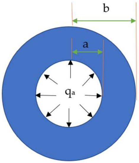 In this study, it is argued that when the temperature is lower than 0 °C, the asphalt mixture will expand due to the freezing of void water (the interstitial water studied in this paper only considers the water in the gap between asphalt mixture frameworks, and the whole article does not include other void water). At the meso level, the void water is regarded as a solid sphere according to the force characteristics of void water freezing in the asphalt mixture, and the asphalt mixture skeleton is regarded as a hollow sphere; the phase change process of void water freezing becomes a process of a sphere expansion under spherical constraint, as shown in Figure 1 [27]. The skeleton constrains the icing expansion of water in the asphalt mixture voids, and the volume expansion force, generated by the ice expansion, uniformly acts on the inner surface of the asphalt mixture skeleton. As shown in Figure 1, the volume expansion force induced by water icing is equivalent to the uniformly distributed load, qa, and a and b denote the inner radius of the void and the outer radius of the asphalt mixture skeleton, respectively. The volumetric expansion coefficient of water icing is 1.09. The void radius increases by approximately 0.03a according to the conversion relationship between the volume and radius. In fact, water icing expansion is constrained by the skeleton, which assumes that the radial compression is ∆b and the actual ice expansion is 0.03a − ∆b.