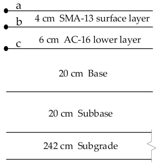 Pavement structure and analysis points. where a is the surface position of surface layer, b is the bottom position of surface layer, c is the bottom position of lower layer.